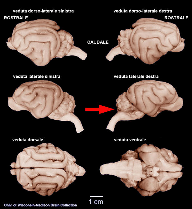 La freccia indica l’encefalo osservato sul lato destro. Dovete essere in grado di identificare facilmente l’estremità anteriore (rostrale – orale) e posteriore (caudale – aborale) per poter stabilire con esattezza se state osservando la faccia sinistra o destra.