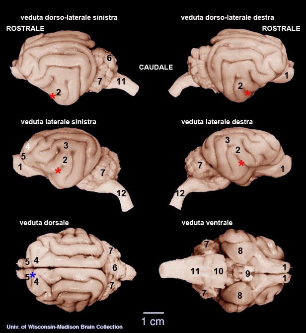 1 = bulbo olfattivo (olfattorio); 2 = circonvoluzione (giro) silviana (circonda la scissura laterale di Silvio indicata con l’asterisco rosso); 3 = circonvoluzione (giro) ectosilviana; 4 = circonvoluzione (giro) postcentrale (caudalmente al solco centrale); 5 = circonvoluzione (giro) precentrale (cranialmente al solco centrale indicato dall’asterisco blu); 6 = verme del cervelletto; 7 = emisfero cerebellare; 8 = lobo piriforme dell’emisfero cerebrale; 9 = chiasma ottico; 10 = ponte; 11 = midollo allungato (bulbo rachidiano); 12 = midollo spinale