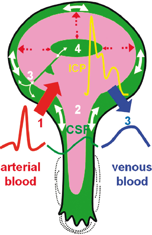 La figura mostra i rapporti tra flusso sanguigno e flusso del liquido cefalo-rachidiano. Il rapido e intenso aumento del flusso arterioso cerebrale [1] aumenta il volume cerebrale negli spazi subaracnoidei intracranici (grandi frecce rosse). In queste aree, la resistenza al flusso è bassa e poiché la viscosità del CSF è bassa, il liquor viene rapidamente spostato dal cranio verso il canale vertebrale [2] che può assorbire l’aumento di pressione per la presenza dello spazio extradurale. L’aumento della pressione intracranica è quindi limitato. Tuttavia, questa prima risposta del liquido cefalo-rachidiano è scarsa e deve essere integrata con un significativo deflusso venoso del sangue cerebrale [3]. A causa della viscosità del sangue, il contributo venoso è più lento ma consente una riduzione di volume notevole. Infine, la riduzione di pressione alla periferia del cervello induce un flusso intraventricolare del liquido cefalo-rachidiano, che fuoriesce dal quarto ventricolo e, attraverso l’acquedotto mesencefalico, passa nei ventricoli laterali determinando un piccolo spostamento interno all’encefalo (piccole frecce rosse). Dopo questa serie di eventi di flusso durante la sistole cardiaca, l’afflusso arterioso all’encefalo bilancia il deflusso venoso e il flusso del liquido cerebrospinale verso il midollo spinale si interrompe. Dopo questo breve momento di equilibrio pressorio, l’aspirazione venosa del cuore aumenta il deflusso venoso cerebrale, diminuisce la pressione intracranica e si inverte il flusso del liquido cefalo-rachidiano del midollo spinale per riempire nuovamente la cavità cranica e preparare il ciclo successivo.