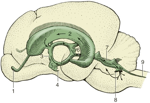 1. recesso olfattorio; 2. ventricolo laterale; 3. terzo ventricolo; 4. infundibolo; 5. recesso ipofisario; 6. acquedotto mesencefalico; 7. quarto ventricolo; 8. foro laterale del velo midollare posteriore; 9. canale centrale del midollo spinale