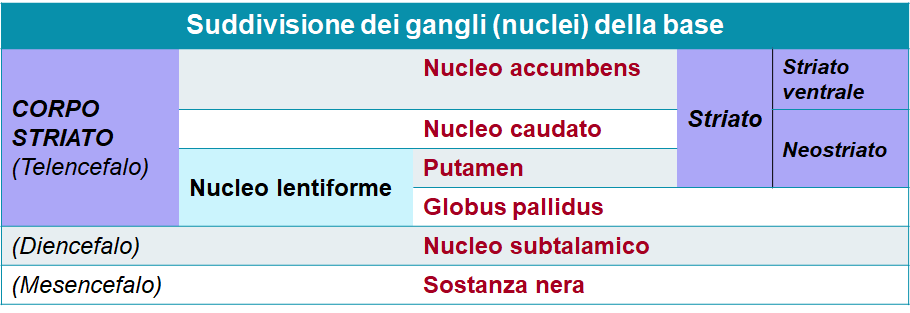 Le sezioni anatomiche (o di risonanza magnetica) dell’encefalo, sia quelle coronali sia quelle orizzontali (vedi sopra), sono utili per capire la localizzazione dei gangli della base. Nel telencefalo è raggruppato il maggior numero di nuclei grigi che li costituiscono. Di questi, il nucleo caudato e il putamen costituiscono, nel loro insieme, il neostriato. Nei Mammiferi di interesse veterinario nucleo caudato e putamen formano un unico caudato-putamen. La testa del nucleo caudato è situata rostralmente rispetto al talamo e medialmente rispetto al braccio anteriore della capsula interna (vedi la figura più sopra in questa stessa pagina). Il putamen è compreso tra capsula interna e capsula esterna. Medialmente si continua con il globo pallido (detto semplicemente pallido), struttura che si insinua lateralmente nel ginocchio della capsula interna. Pallido e putamen nel loro insieme costituiscono il nucleo lentiforme, struttura ben riconoscibile anatomicamente, ma funzionalmente non omogenea. Il putamen, infatti, appartiene allo striato, mentre il pallido rappresenta una struttura funzionalmente autonoma, punto cruciale dei circuiti dei gangli della base. Ventralmente rispetto al talamo è presente il nucleo subtalamico, che appartiene al diencefalo. Nel mesencefalo è presente una struttura pigmentata, la sostanza nera. Il nucleo accumbens, che fa parte del sistema limbico, è situato ventralmente alla testa del nucleo caudato; per questo motivo si dice che costituisce lo striato ventrale. Quest’ultimo con il neostriato forma lo striato, che, a sua volta, fa parte del corpo striato del telencefalo, come schematizzato nella tabella.