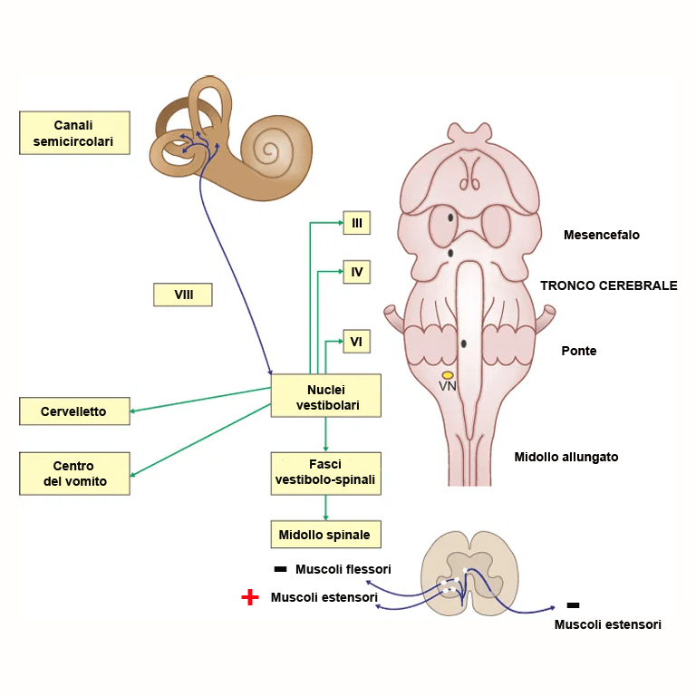 Le proiezioni dai nuclei vestibolari si estendono a diversi nuuclei di neuroni del tronco cerebrale, al midollo spinale e al cervelletto. I movimenti oculari riflessi (riflessi vestibolo-oculari) dipendono dalle fibre che terminano nei nuclei motori dei nervi oculomotore, trocleare e abducente e intervengono nel determinare i movimenti coniugati degli occhi per fissare lo sguardo su un determinato bersaglio. Questi circuiti fanno capo al labirinto dinamico dell’orecchio interno. Alcuni degli assoni che originano dal nucleo vestibolare laterale (il più sviluppato) e dai nuclei vestibolare mediale e caudale ricevono afferenze dalle macule (labirinto statico) vanno a costituire i fasci vestibolo-spinale laterale e vestibolo-spinale mediale che terminano facendo sinapsi sui motoneuroni spinali che innervano i muscoli del collo, del tronco e degli arti. In particolare, la stimolazione dei nuclei vestibolari aumenta il tono dei muscoli estensori (antigravitari) e dei muscoli flessori (gravitari) omolateralmente e inibisce il tono muscoli estensori controlaterali. Questi circuiti riflessi (riflessi vestibolo-spinali) sono fondamentali nel mantenimento dell’equilibrio sia in stazione che durante il movimento. Le proiezioni al cervelletto consentono la coordinazione della posizione degli occhi, del collo, del tronco e degli arti con la posizione della testa (propriocezione inconscia). Inoltre, le proiezioni alla corteccia cerebrale consentono la percezione cosciente del movimento e della gravità (propriocezione conscia) necessaria a una corretta esecuzione dei movimenti volontari.