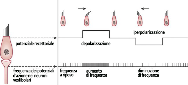 Le componenti periferiche sono contenute nella porzione petrosa dell’osso temporale (rocca petrosa o osso petroso) in cui è contenuto l’orecchio interno. Quest’ultimo è formato da un complicato sistema di canali e spazi ossei scavarti all’interno dell’osso petroso, il labirinto osseo, entro cui è contenuto un altrettanto complicato insieme di formazioni a parete sottile, membranosa, il labirinto membranoso, che ne ricalca la forma. Entrambi i labirinti sono costituiti da un vestibolo (osseo e membranoso) e da una coclea (chiocciola – ossea e membranosa) e sono separati fra loro da uno spazio ripieno di perilinfa, un liquido con composizione simile a quella dei liquidi extracellulari. All’interno del labirinto membranoso è, invece, contenuta l’endolinfa, un liquido con caratteristiche simili al citosol. Mentre nel vestibolo membranoso sono localizzati i recettori dell’equilibrio, nella coclea membranosa sono localizzati i recettori acustici. I recettori dell’equilibrio, che fanno parte della componente periferica del sistema vestibolare, si trovano nelle macule, a livello del sacculo e dell’utricolo, e nelle creste ampollari, a livello dei canali semicircolari. La componente periferica del sistema vestibolare è completata dai neuroni del ganglio vestibolare che, con i loro dendriti, formano giunzioni cito-neurali con le cellule capellute, i recettori statocinetici vestibolari, e, con i loro assoni, costituiscono il n. vestibolare che termina nel ponte. I recettori statocinetici delle macule e delle creste ampollari sono cellule sensitive secondarie. Si tratta di cellule epiteliali modificate che si sono specializzate nella trasduzione di segnali meccanici (movimenti dell’endolinfa) in segnali elettrici. Il loro polo apicale è modificato in maniera caratteristica: presenta lunghe stereociglia e un chinociglio molto sviluppato, motivi per cui queste cellule sono chiamate cellule capellute. A riposo, quando le stereociglia non sono deviate, i neuroni sensitivi primari del ganglio vestibolare, che fanno sinapsi al polo basale delle cellule capellute trasmettono spontaneamente circa 100 potenziali d’azione al secondo. Quando le stereociglia si piegano in direzione del chinociglio, le cellule si depolarizzano e rilasciando il loro neurotrasmettitore (glutamato o aspartato) alle giunzioni cito-neurali con i neuroni vestibolari, che, di conseguenza, aumentano la frequenza dei potenziali d’azione. Quando le stereociglia sono piegate in direzione opposta, le cellule capellute si iperpolarizzano, il rilascio del trasmettitore diminuisce e la frequenza del potenziale d’azione dei neuroni sensoriali diminuisce. Pertanto, lo spostamento delle stereociglia delle cellule capellute in una di queste direzioni può essere rilevato dal cervello come un aumento o una diminuzione della frequenza del potenziale d’azione a riposo. Le deviazioni in altre direzioni sono molto meno efficaci.