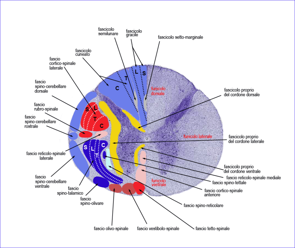 Le vie propriospinali, costituite dai fascicoli propri (in giallo nella figura sottostante), sono presenti in tutti i funicoli della sostanza bianca e sono, in genere, poste profondamente, a contatto con la sostanza grigia. Le vie motrici (in rosso/rosa nella figura) sono poste in posizione intermedia nei funicoli laterale e ventrale. Le vie sensitive (in blu/azzurro nella figura) sono situate in posizione più superficiale nei funicoli dorsale e laterale. Quindi il funicolo ventrale è costituito per la quasi totalità da fibre motrici, quello dorsale da fibre sensitive e quello laterale le contiene entrambe.