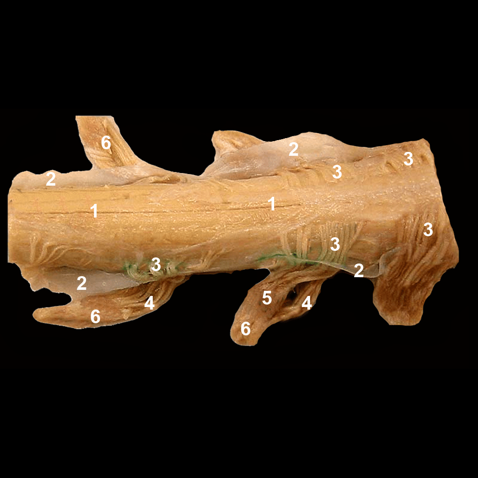 1. 1: solco mediano dorsale; 2: dura madre; 3: radicole e radici dorsali dei nervi spinali; 4: radicole e radici ventrali dei nervi spinali; 5: ganglio spinale; 6: tronco del nervo spinale.
