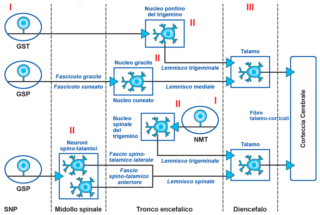 La via della colonna dorsale-lemnisco mediale/nucleo pontino del n. trigemino/lemnisco trigeminale