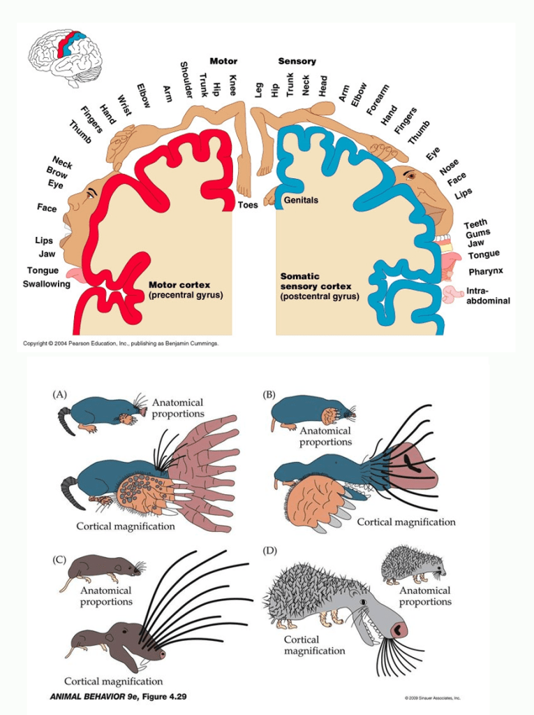 In basso: ingrandimento corticale di specifiche aree corporee in alcuni animali con abitudini di vita particolari: A: talpa dal naso stellato; B: talpa comune; C: ratto; D: porcospino. L’enorme ingrandimento corticale delle aree somatosensitive del naso e della mano nelle talpe riflettono i bias sensoriali adattativi che dipendono dalla vita sotterranea e dalla pressoché totale cecità di questi animali. L’ingrandimento corticale delle aree destinate alle vibrisse e alla testa nel ratto e nel porcospino dipendono dalla elevata sensibilità tattile dei baffi e della superficie cutanea della testa.