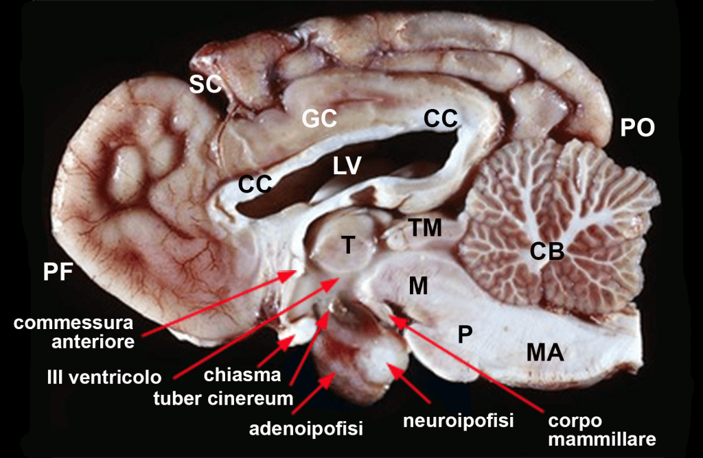 2. L’eminenza mediana è la parte più anteriore della neuroipofisi, situata alla base dell’ipotalamo. In essa i fattori di rilascio e di inibizione degli ormoni ipofisari prodotti dall’ipotalamo convergono sul sistema capillare portale che vascolarizza l’ipofisi anteriore. Questa regione funge da interfaccia chiave tra i sistemi neurali ed endocrini coinvolti nella regolazione ipotalamo-adenoipofisaria della riproduzione, dello stress, dell’allattamento, della crescita e dell’attività tiroidea e metabolica. L’eminenza mediana è una struttura neurale molto insolita: sebbene contenga terminali nervosi e cellule gliali, è praticamente priva di sinapsi e possiede proprietà strutturali che la distinguono dalle altre regioni del SNC.