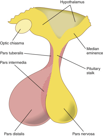 3. Il lobo (parte) tuberale una della parti che costituiscono l’adenoipofisi. È una guaina tubolare che si estende dalla parte distale e si avvolge intorno al peduncolo ipofisario. In essa sono presenti cellule epiteliali disposte in cordoni e i vasi destinati alla parte distale. La parte tuberale è caratteristica di tutti i vertebrati tetrapodi, ma la comprensione del suo significato fisiologico è limitata. La presenza di cellule contenenti alcuni ormoni ha portato a suggerire che la parte tuberale sia solo un’estensione della parte distale legata principalmente alla riproduzione. Tuttavia, studi recenti hanno dimostrato che essa è un importante collegamento endocrino tra la ghiandola pineale e le cellule secernenti prolattina della parte distale. Strutturalmente le cellule della parte tuberale sono collegate al liquido cerebrospinale del terzo ventricolo attraverso processi cellulari originati da cellule ependimali modificate note come taniciti. È stato suggerito che i taniciti possano rimuovere selettivamente alcune molecole, incluse quelle di tipo regolatore quali gli ormoni, dal liquido cerebrospinale e trasferirle alle cellule della parte tuberale, facendo sì che queste ultime rilascino i loro prodotti di secrezione fra cui la tuberalina che agisce sul rilascio di prolattina.