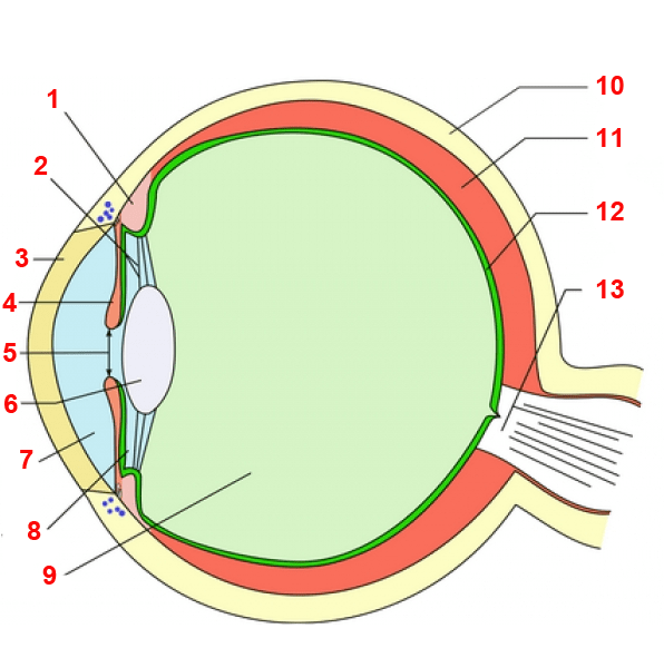 1. 1 = corpo ciliare; 2 = legamento sospensore del cristallino (fibre zonulari); 3 = cornea; 4 = iride; 5 = pupilla; 6 = cristallino; 10 = sclera; 11 = coroide; 12 = retina; 13 = n. ottico.