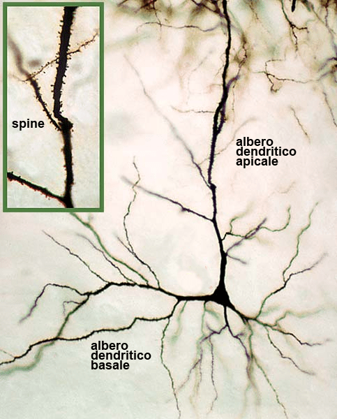 3. Le spine dendritiche formano l’elemento post-sinaptico delle sinapsi asso-dendritiche presenti sugli alberi dendritici dei neuroni piramidali.