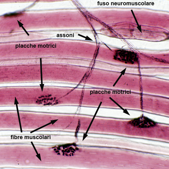 L’immagine mostra una preparazione in toto di alcune fibre muscolari dopo impregnazione argentica delle fibre nervose che le innervano. In altre parole, non è un preparato a partire d una sezione tagliata all’ultramicrotomo, ma si tratta di singole fibre nervose (sei per la precisione) separate fra loro, posizionate su un vetrino e colorate. Le “protuberanze” sulle singole fibre muscolari sono placche motrici o giunzioni neuromuscolari. Puoi facilmente distinguere gli assoni che contattano le singole fibre muscolari per ramificarsi a formare ciascuno una placca motrice. Nei vertebrati, ogni fibra muscolare scheletrica, non importa quanto lunga possa essere, ha solo una di queste giunzioni neuromuscolari.