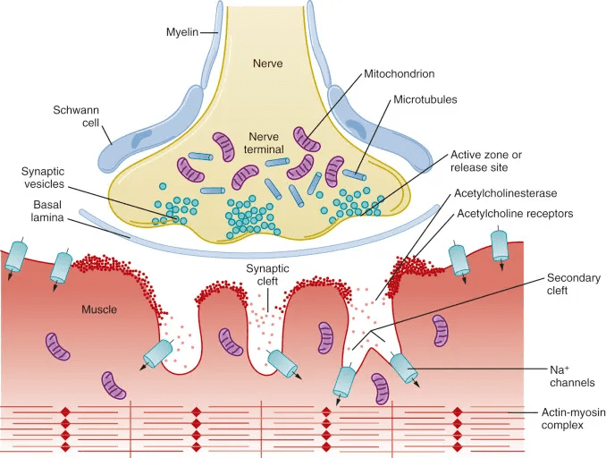 Quando un potenziale d’azione raggiunge il terminale nervoso, i canali ionici voltaggio-dipendenti si aprono con un conseguente un afflusso di calcio. Ciò si traduce nella fusione con la membrana assonale di 200-400 vescicole dal pool di acetilcolina a rilascio rapido e nel successivo rilascio del neurotrasmettitore nella fessura sinaptica.