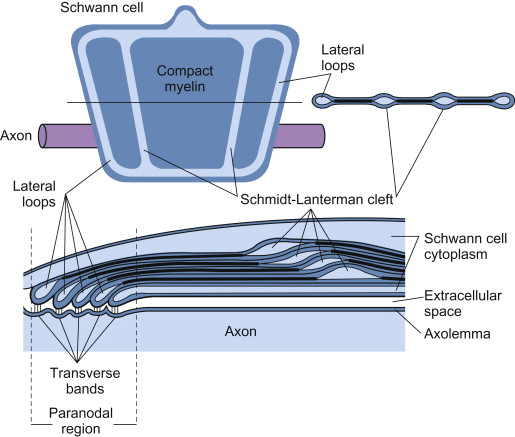 3. Le incisure di Schmidt-Lanterman sono discontinuità della guaina mielinica dovute alla presenza dei canali citoplasmatici delle cellule di Schwann. L’osservazione con il microscopio elettronico a trasmissione ha permesso di capire che le incisure sono zone dove le lamelle della mielina sono separate ma non interrotte. Gli spazi creati dalla separazione delle membrane appaiate contengono infatti il citoplasma della cellula di Schwann.