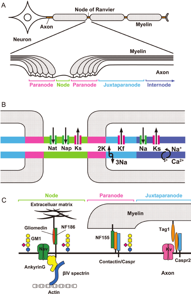 I nodi contengono alte concentrazioni di canali del sodio voltaggio-dipendenti, responsabili dell’aumento del potenziale di membrana durante la generazione di un potenziale d’azione. Nelle regioni direttamente adiacenti ai nodi, denominate paranodi, gli strati della mielina formano una giunzione serrata stretta (SpJ) con la membrana assonale. Questa giunzione fornisce un’impalcatura all’interno dell’assone per compartimentalizzare le molecole e limitare il movimento dei canali ionici. Sul lato di questa giunzione opposta al nodo, chiamato juxtaparanode, c’è un’alta concentrazione di canali del potassio voltaggio-dipendenti che facilitano il ritorno del potenziale di membrana al valore basale dopo il passaggio del potenziale d’azione. Per una propagazione efficiente del potenziale d’azione, è fondamentale che i canali del sodio e del potassio voltaggio-dipendenti rimangano in regioni distinte.