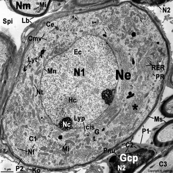 Cmv = corpi multivescicolari; Ec = eucromatina; G = apparato di Golgi; Gcp = cellula gliale del sistema nervoso periferico (cellula di Schwann); Hc = eterocromatina; Ko = fibre collagene; Lb = lamine basali delle cellule gliali; Lyp = lisosoma; Lyt = telolisosomi (granuli di lipofuscina); Mi = mitocondri ; Mn = membrana nucleare; Ms = guaina mielinica; N1 = nucleo della cellula gangliare; N2 = nucleo di una cellula gliale; Nc = nucleolo; Ne = neurone (corpo della cellula nervosa; qui una cellula gangliare bipolare del ganglio spirale cocleare dell’orecchio interno); Nf = neurofilamenti; Nm = processo delle cellule nervose mielinizzate; Nt = Neurotubuli; P1 = Plasmalemma (membrana cellulare) di una cellula gliale; P2 = Plasmalemma (membrana cellulare) della cellula gangliare; Pnu = poro della membrana nucleare; PR = poliribosomi; RER = reticolo endoplasmatico rugoso; Spi = spazio intercellulare); t = parte trans di un apparato del Golgi); * = Corpo di Nissl (ergastoplasma; costituito da RER e PR strettamente aggregati).